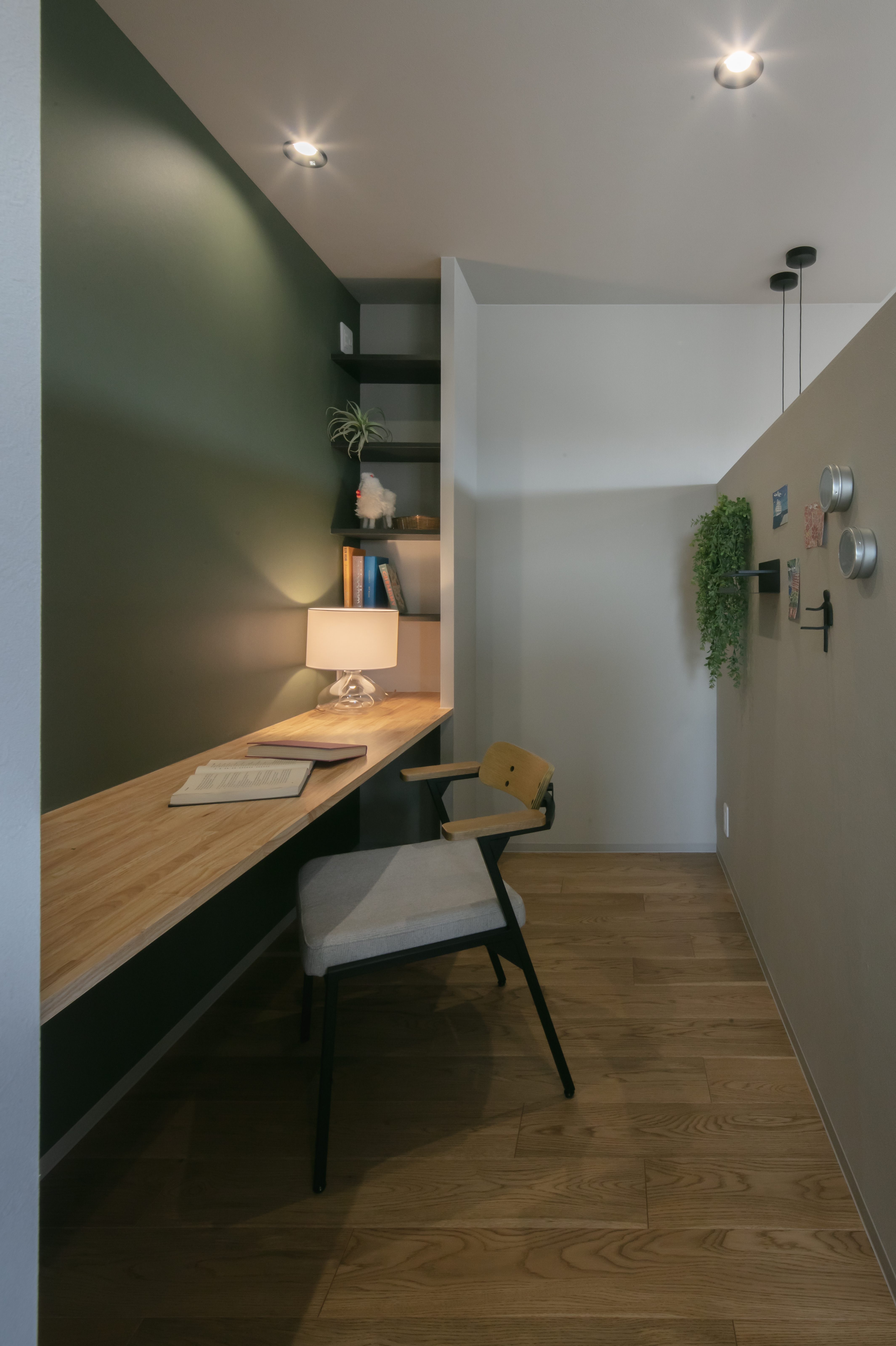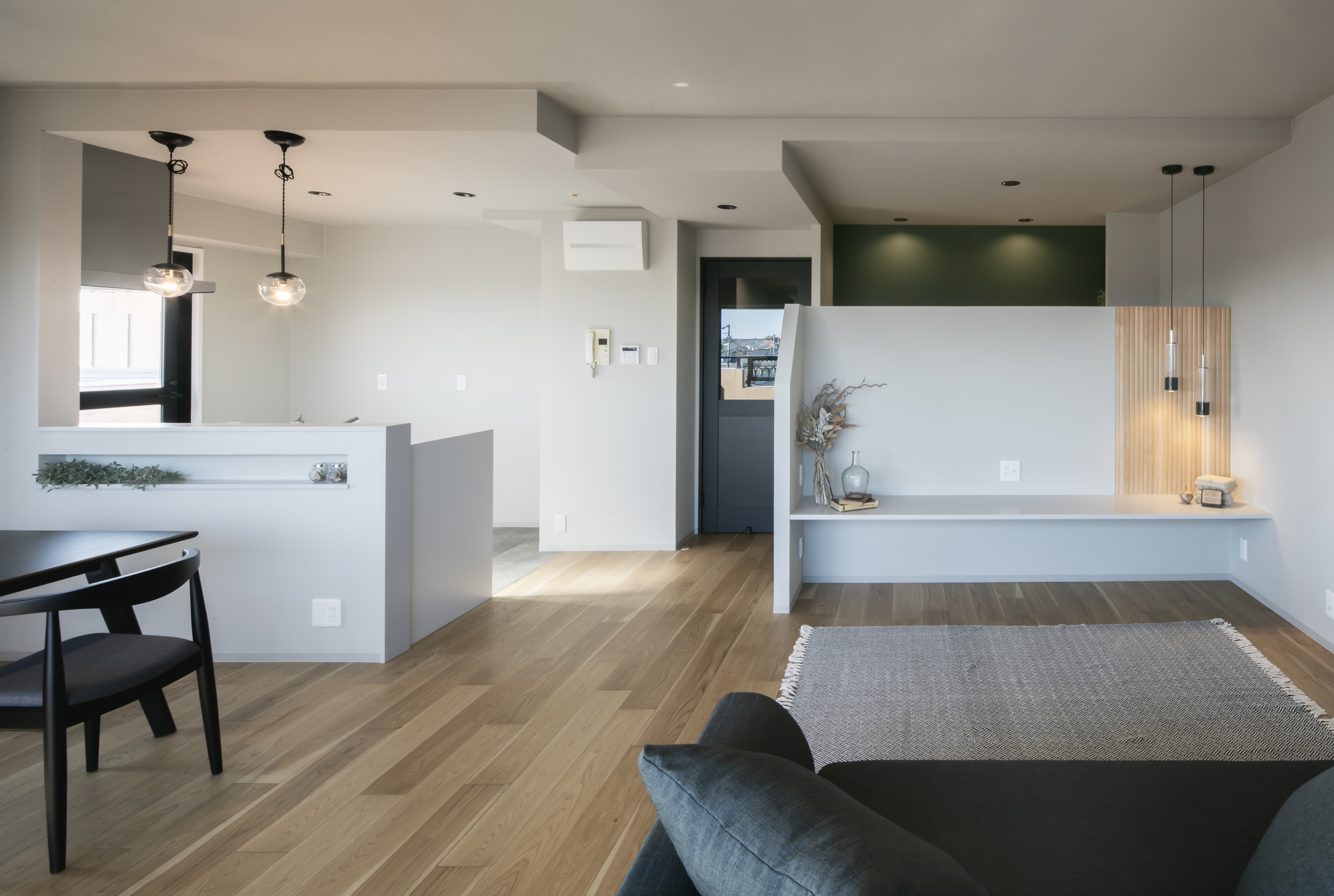 - 広いカウンターのデスクスペースが、間仕切り壁でゆるくリビングと繋がります