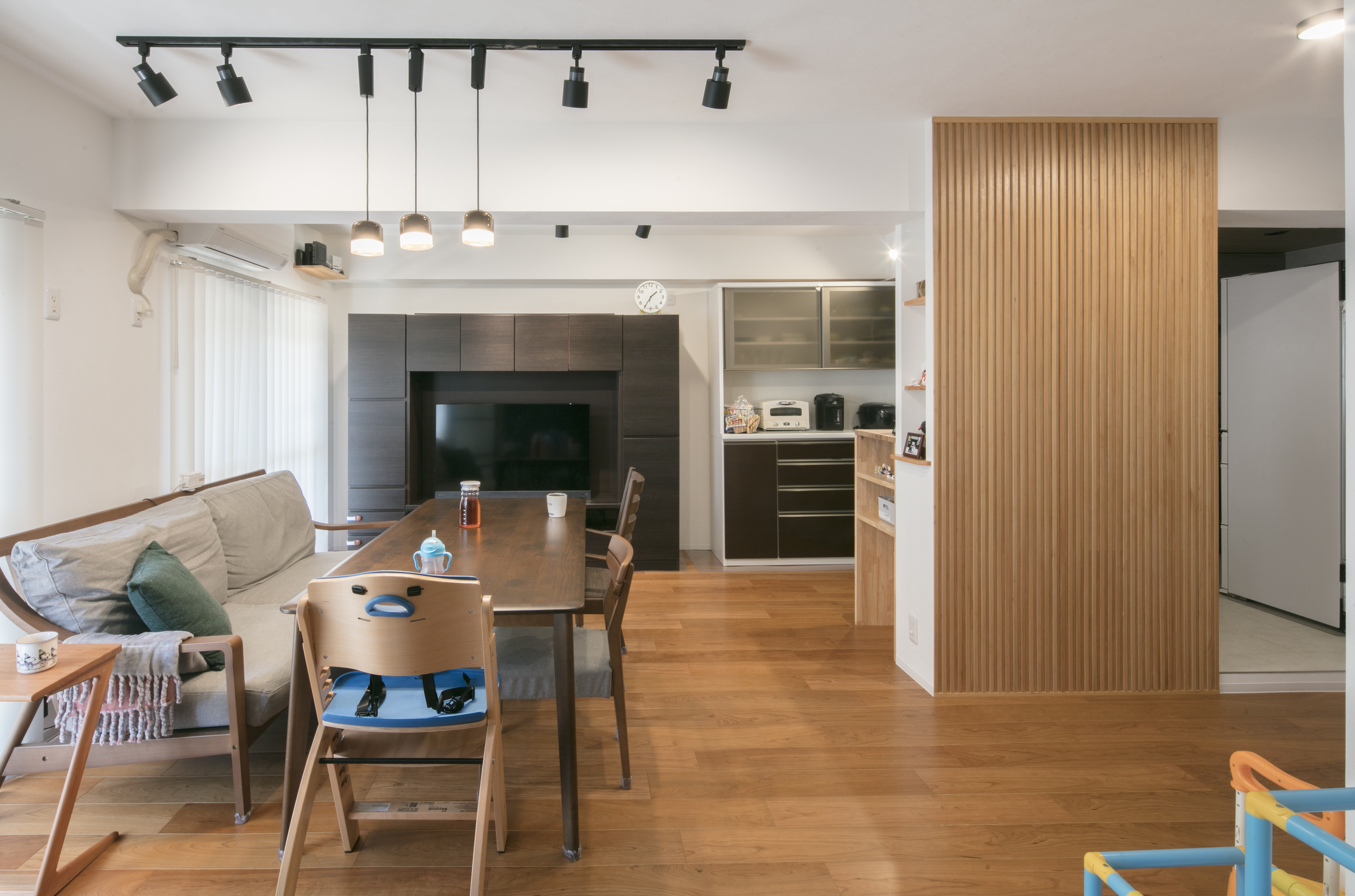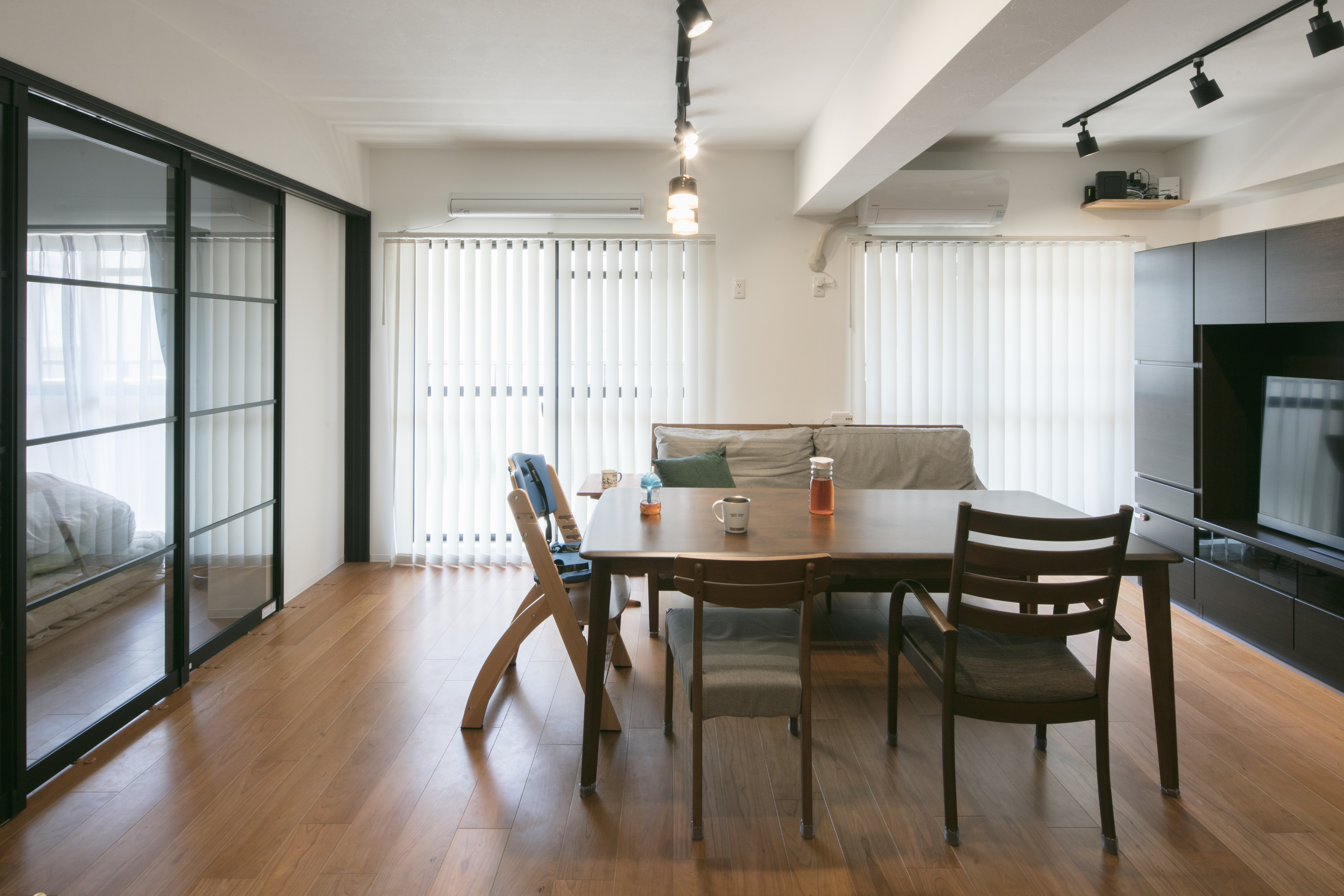 大型間仕切りのガラスドアがリビングとプライベート空間を緩く区切ります。