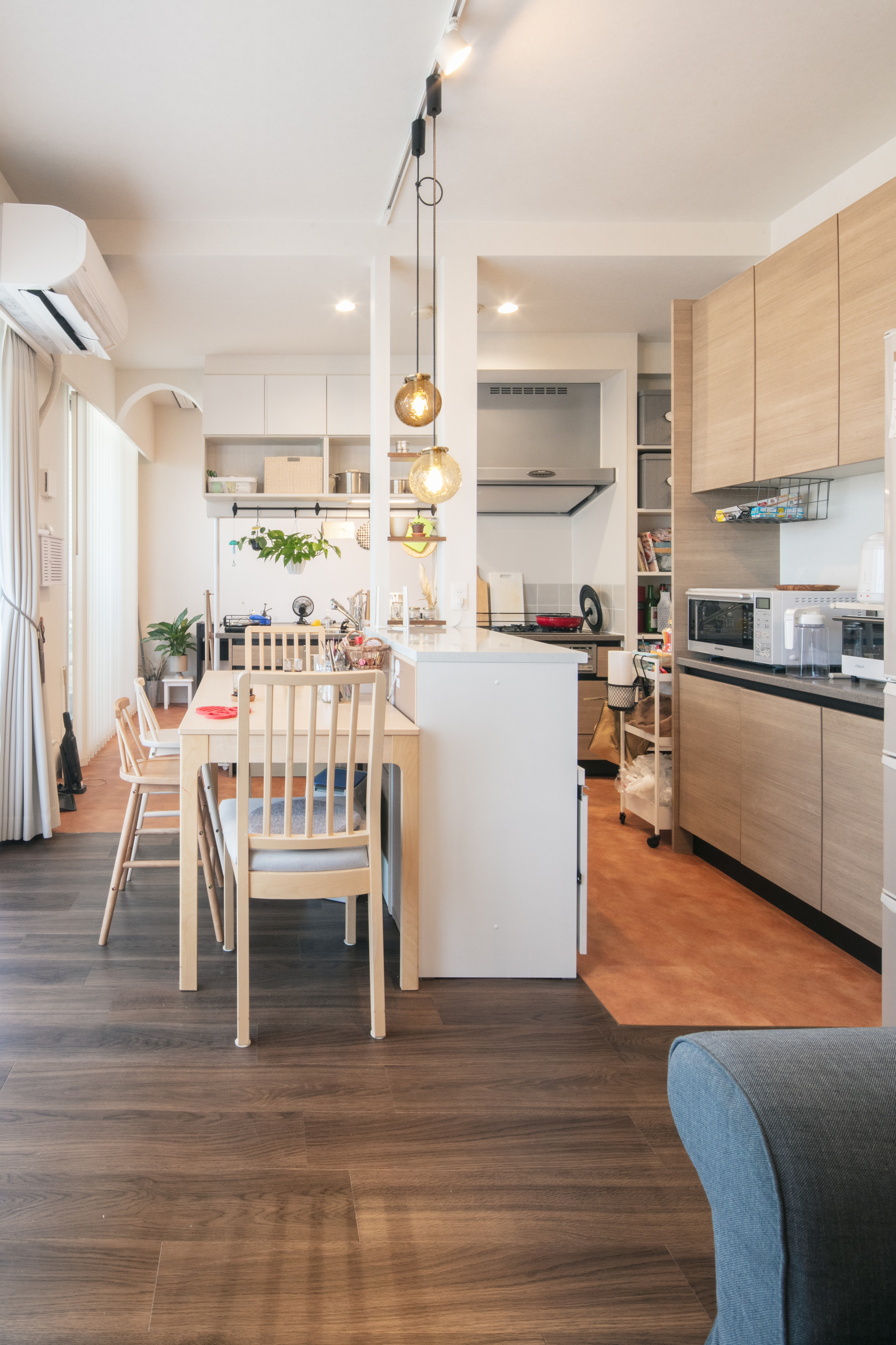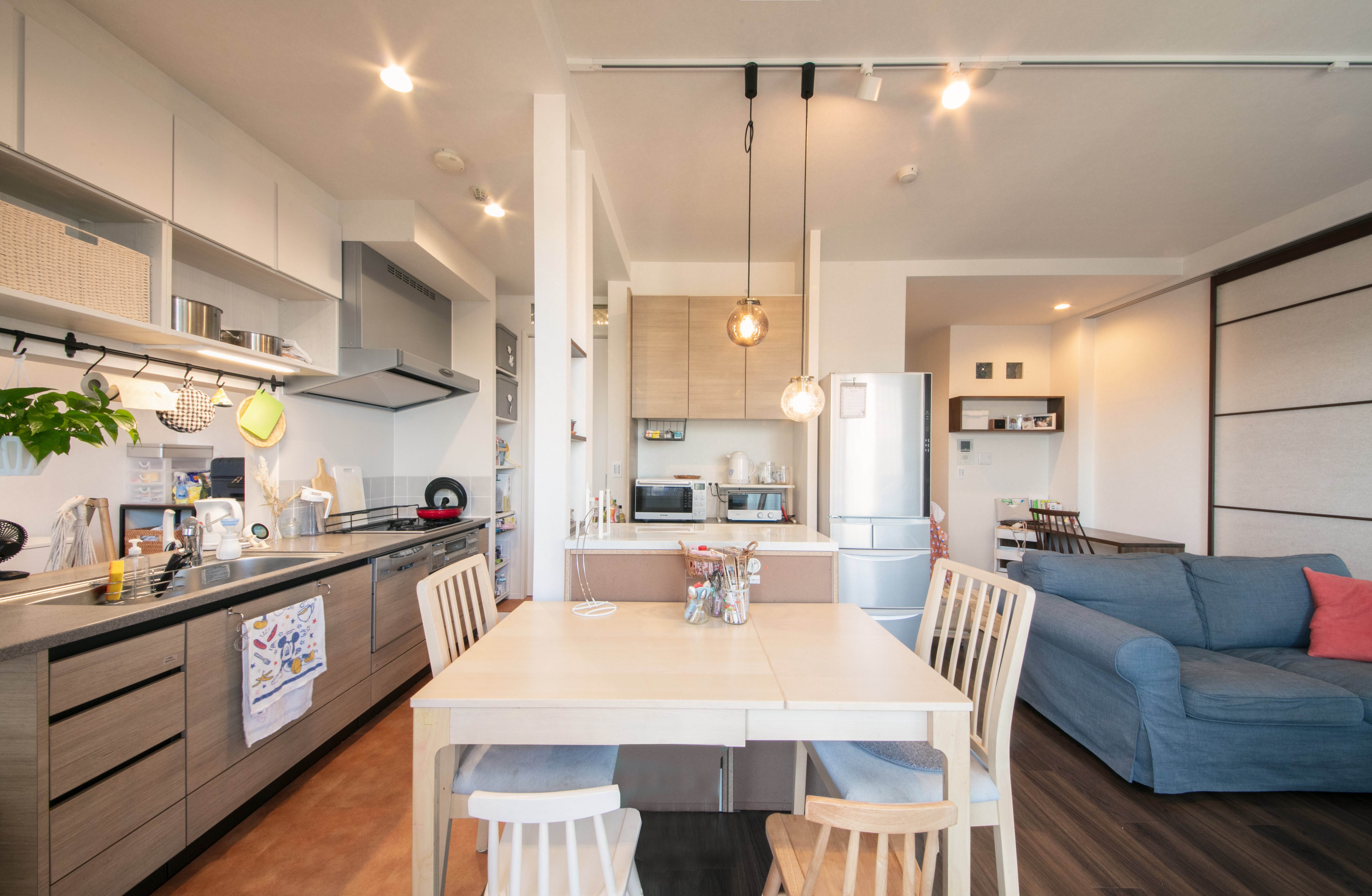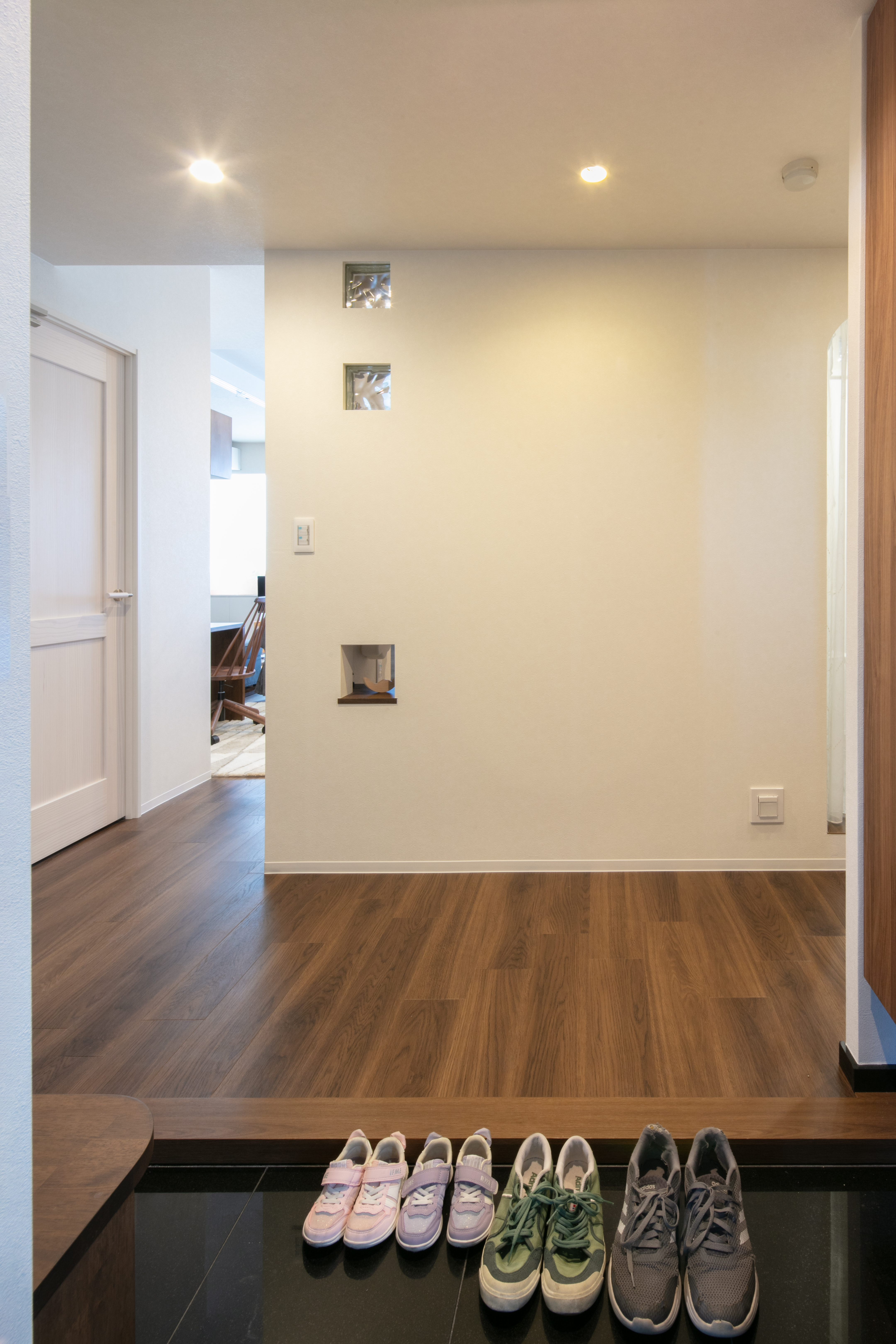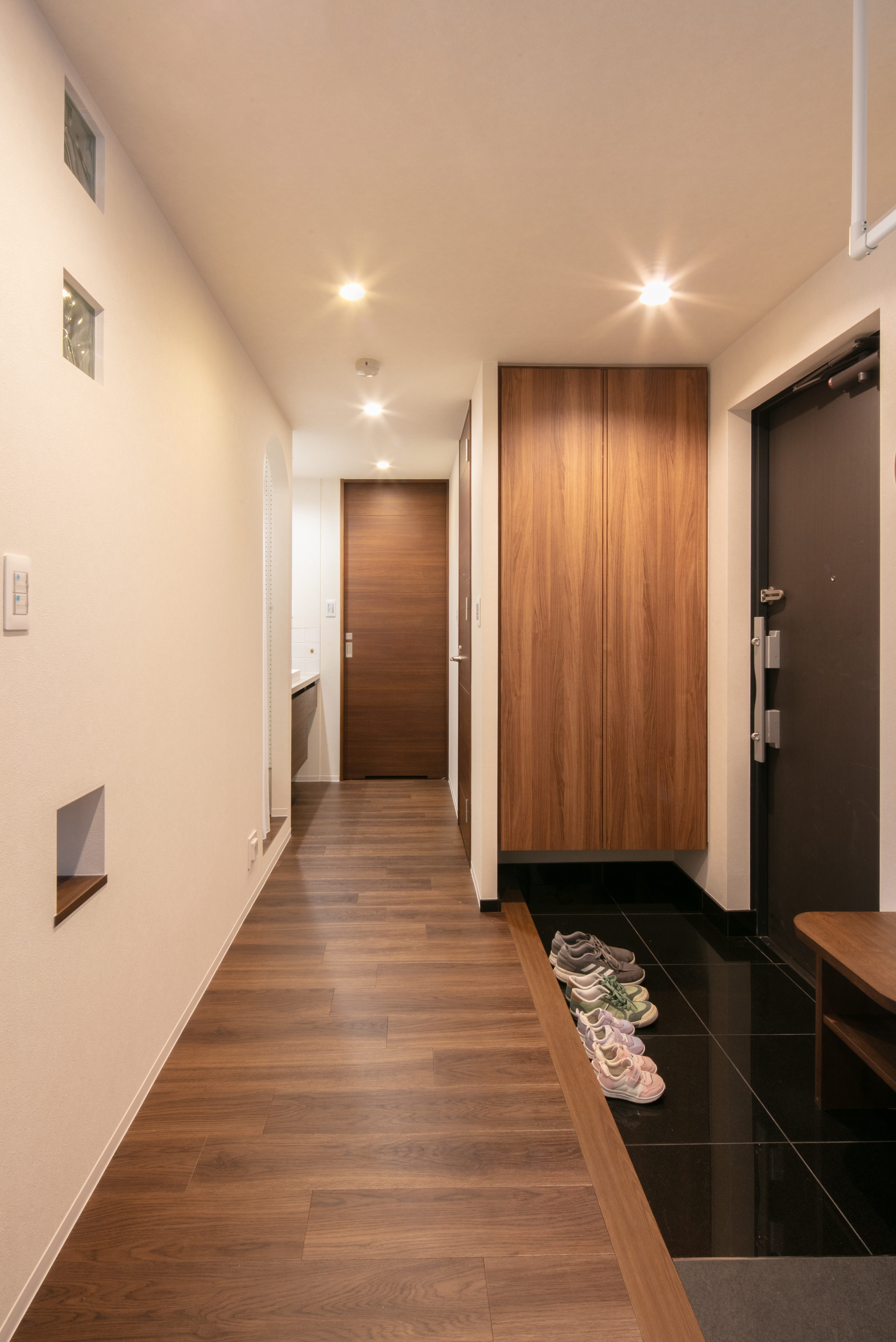 木のぬくもりを感じるフローリングと落ち着いた色合いで統一された、心地よい住まい。玄関から続くすっきりとした廊下を抜けると、大きな窓から光が差し込む明るいリビング・ダイニングが広がります。