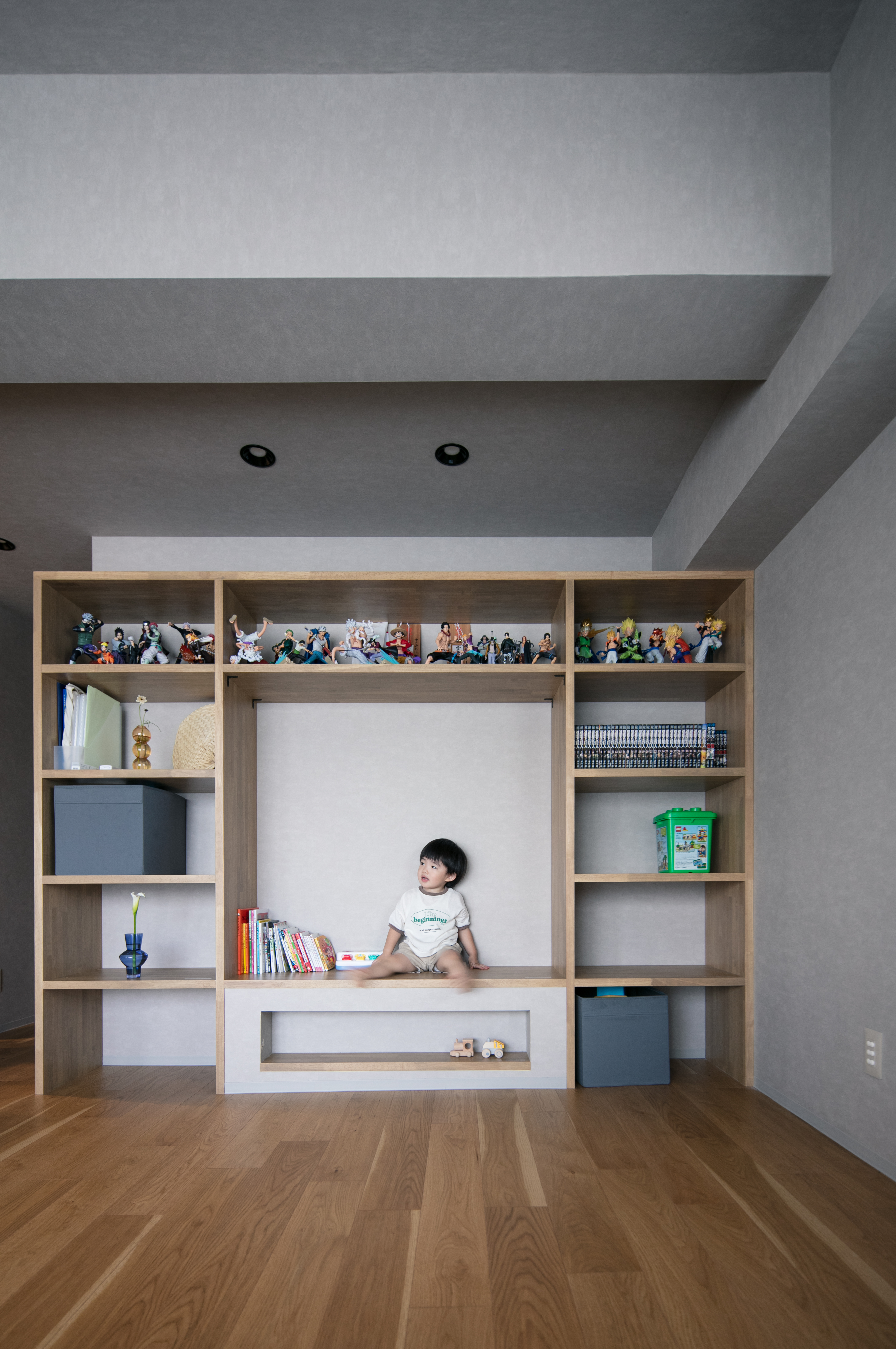 お気に入りの本やフィギュアが並ぶ、家族の“ギャラリー”のような本棚。
